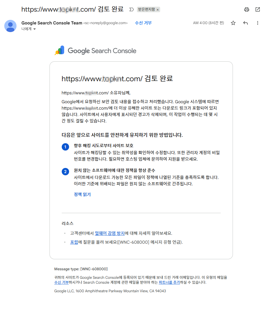 검토 요청 이후 구글로 부터 검토 완료 메일을 받았습니다.