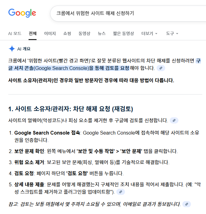 유해 프로그램이 모두 삭제되었다면 이제 해제 요청을 해야합니다.